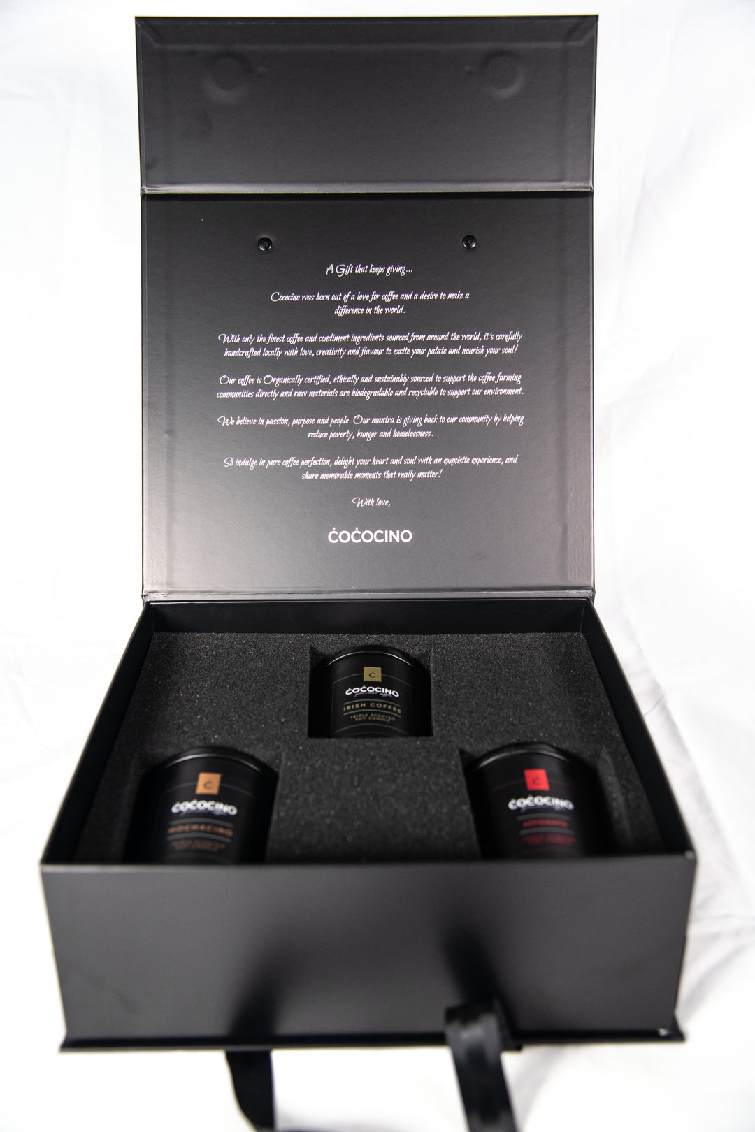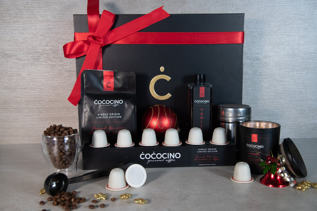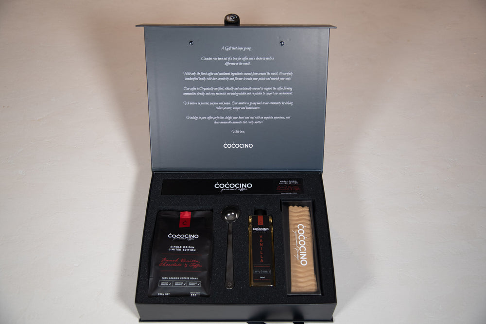 Cococino's Coffee hamper and Coffee Gift Box consists of Single Origin Organic Arabica Coffee beans (250g), Nespresso machine compatible Biodegradable coffee pods (10 Pack), Vanilla Syrup(280ml) plus a 300g Log of Caramel fudge along with a measuring spoon.